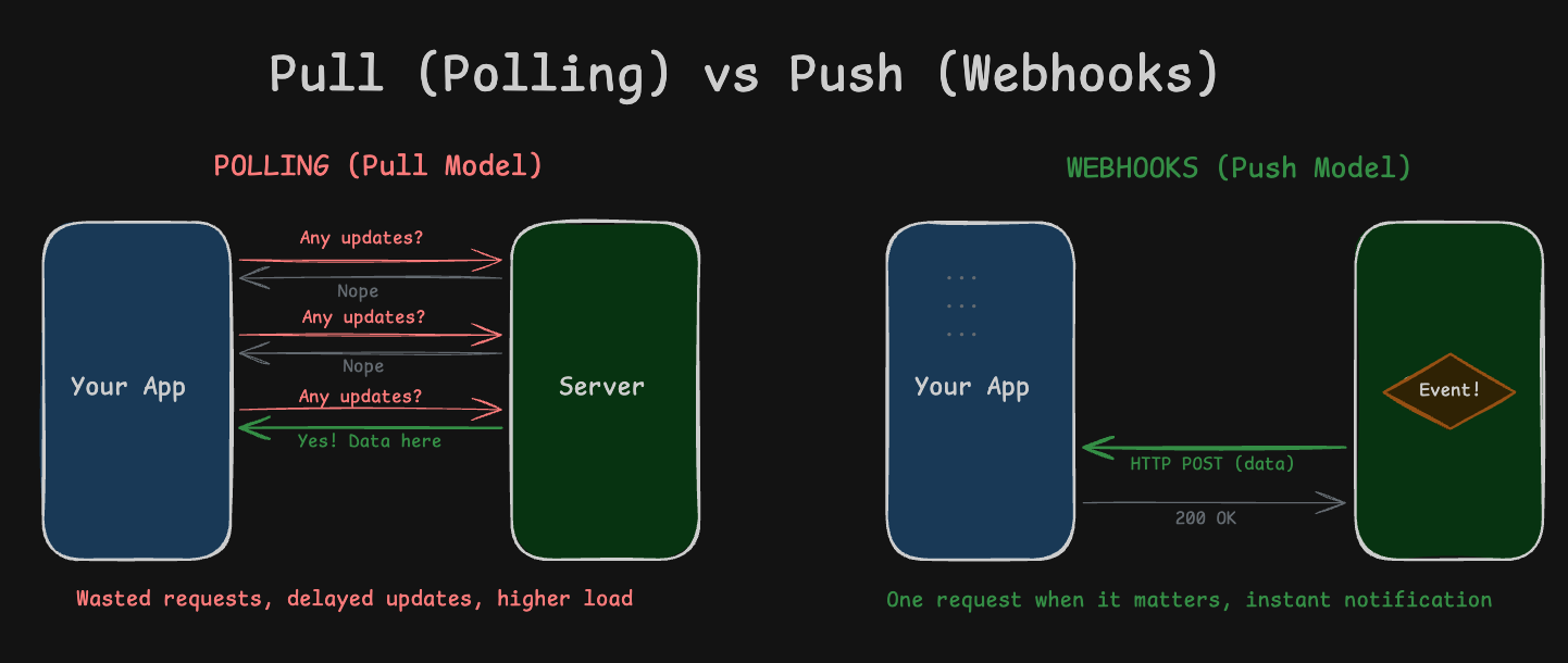 Push beats pull for event-driven systems. Webhooks eliminate polling overhead and enable real-time reactions.