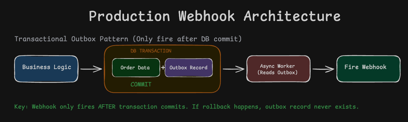 Never fire webhooks before database commits. Use the transactional outbox pattern to ensure consistency.