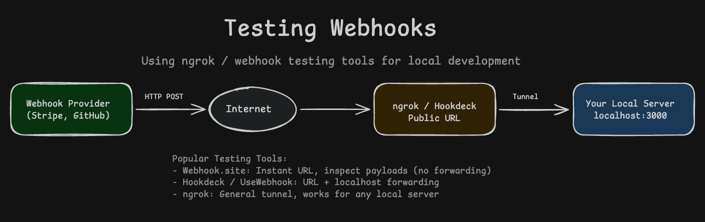 Testing webhooks is uniquely challenging. The external service needs to send requests to your server, but during development, your server is probably running on localhost:3000. Stripe cannot reach that.