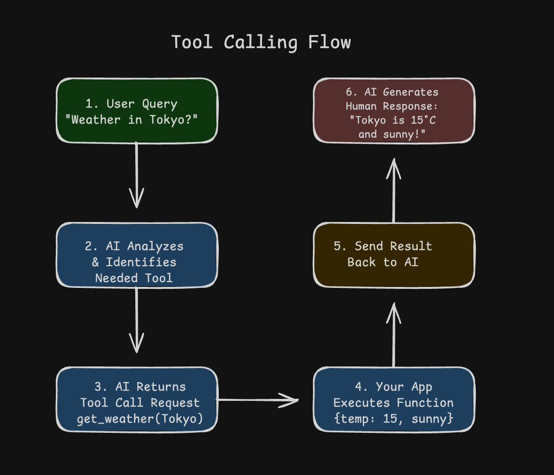 When a user asks "What's the weather in Tokyo?", the AI goes through a quick decision process. It understands the intent, recognizes it needs current weather data, identifies the right tool (get_weather), and extracts the parameters (location: Tokyo). Then it formats everything into a structured tool call request.